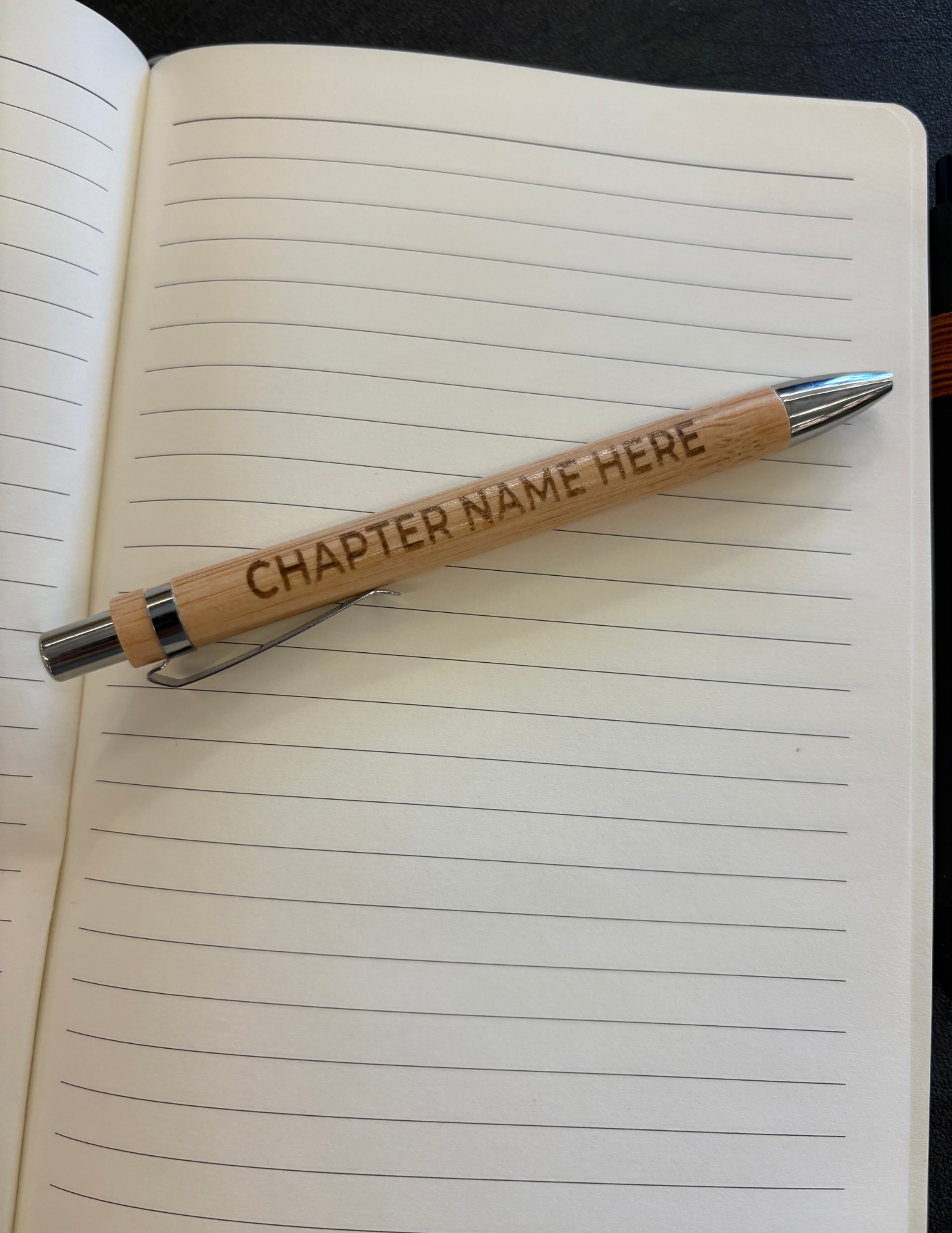 Write with purpose. This smooth-writing bamboo pen combines sustainable materials with your chapter logo for a practical, earth-friendly touch.